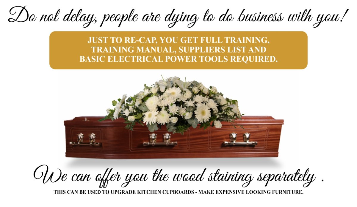 You will be able to make 20 coffins per week depending on your woodworking skills. Obviously, as you start making more coffins, you will need bigger machines, staff and a larger premises. With the profit of the sale of your coffins, you will easily be able to afford all this.